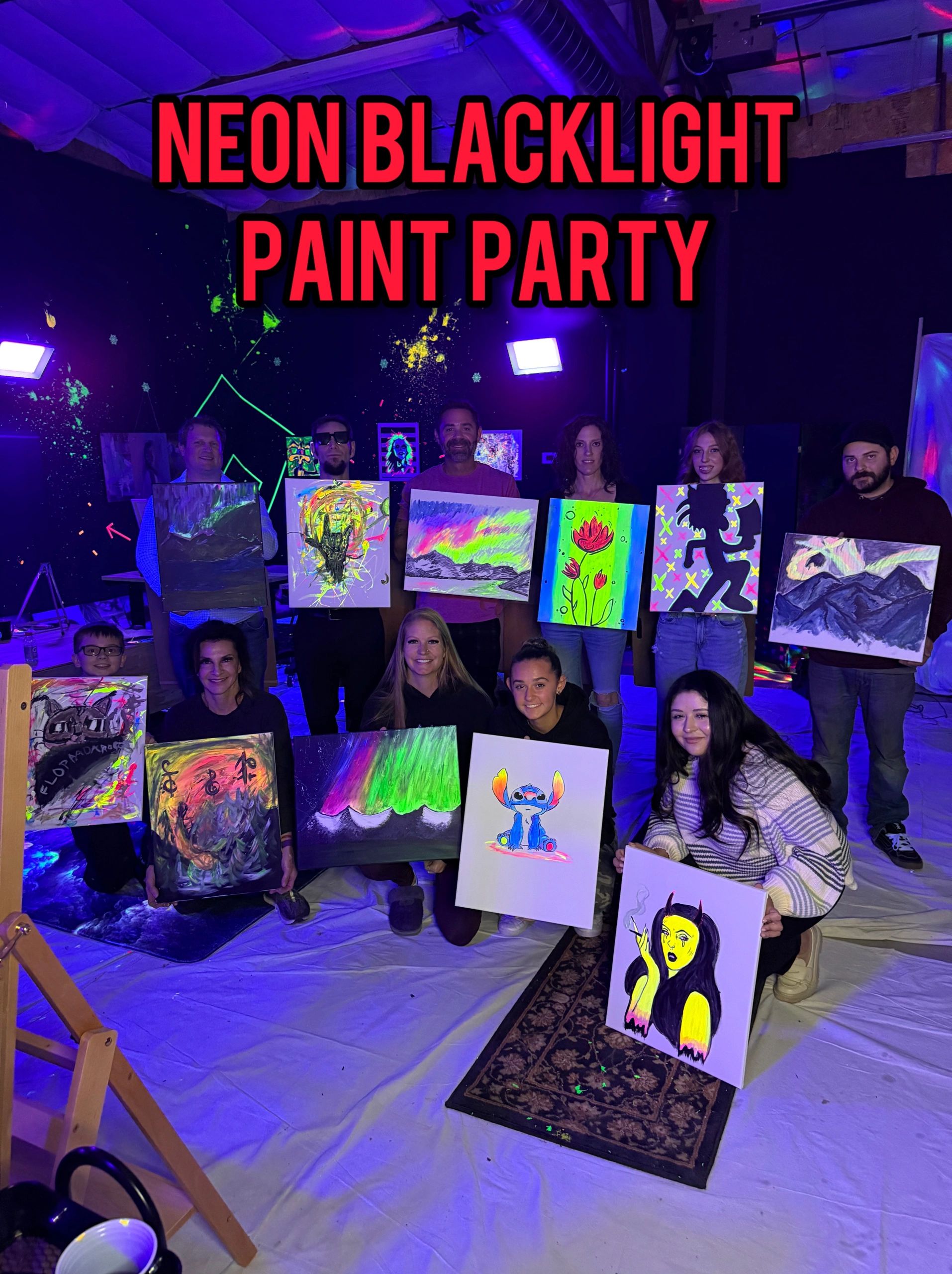 This art class is designed for all skill levels and ages, using neon paint in amazing glow-in-the-dark environment!